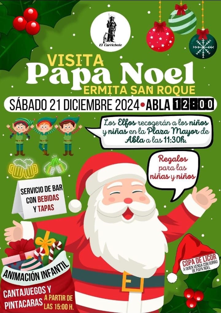 - A partir de las 11:30, los elfos guiarán a los niños hacia la ermita de San Roque, donde podrán visitar a Papa Noel y recibir regalos.